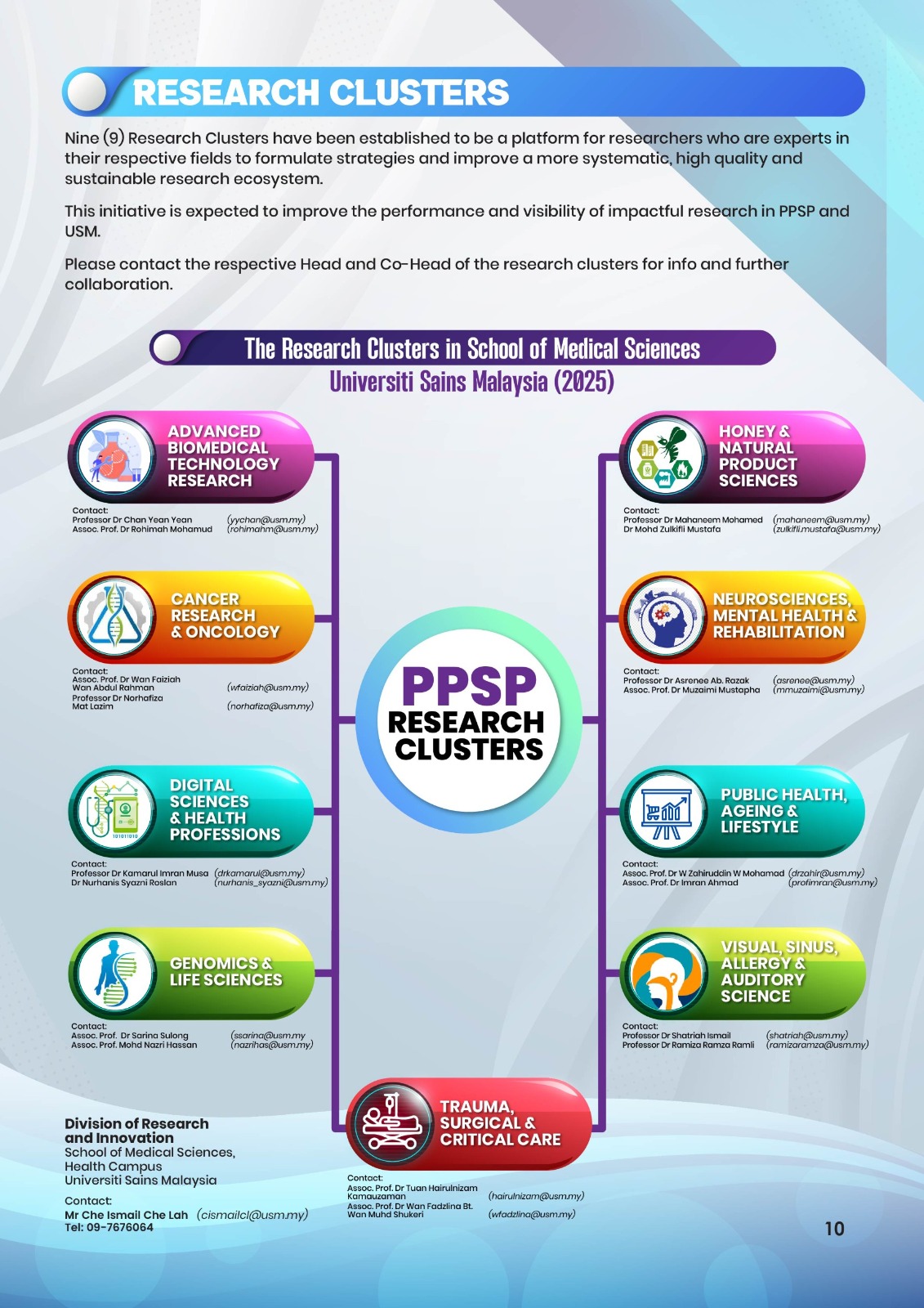 Nine (9) Research Clusters have been established to be a platform for researchers who are experts in their respective fields to formulate strategies and improve a more systematic, high quality and sustainable research ecosystem. This initiative is expected to improve the performance and visibility of impactful research in PPSP and USM.